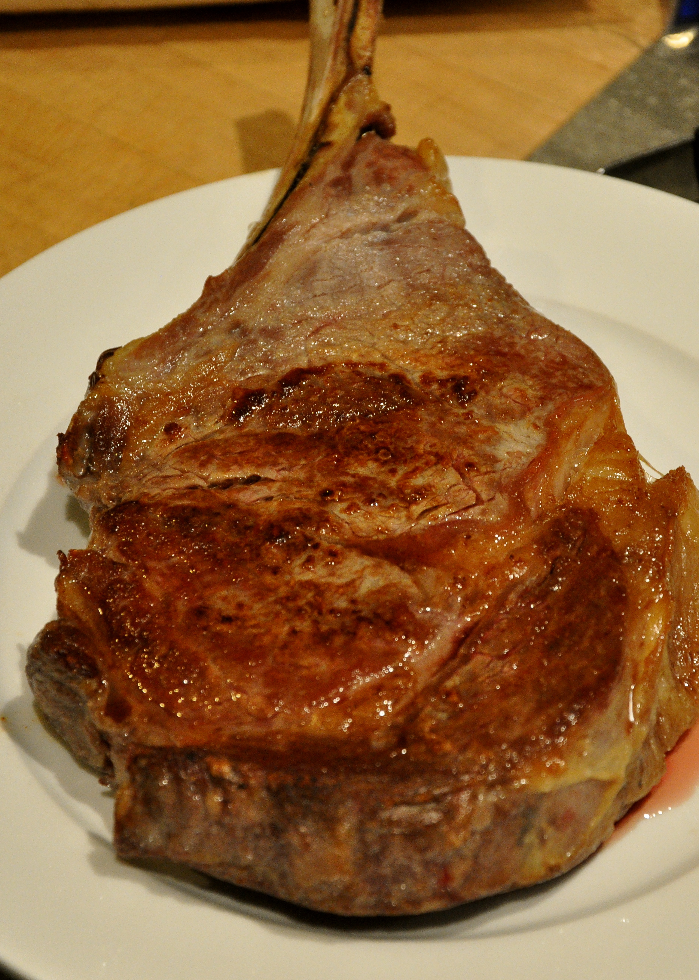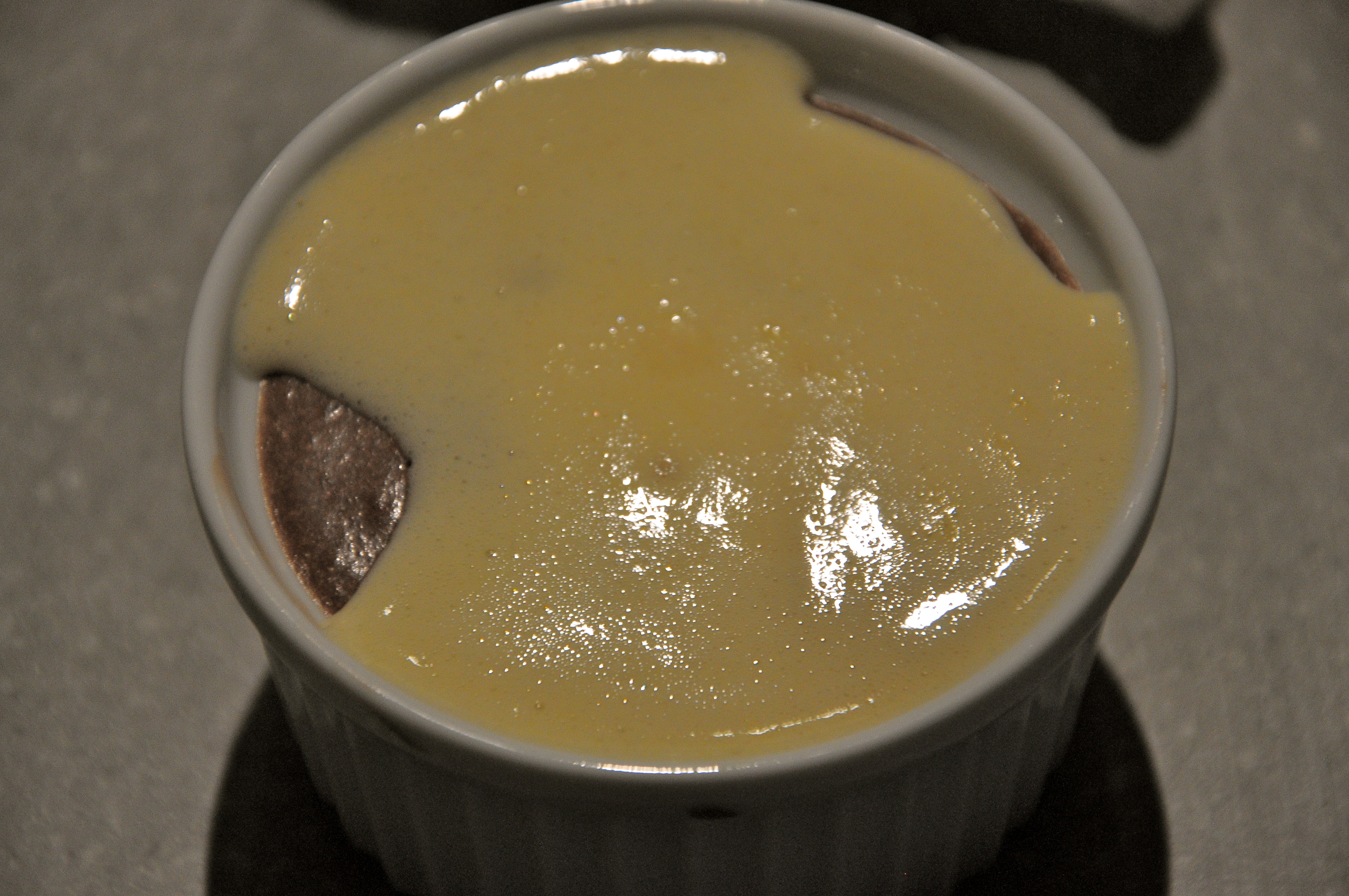We started the evening by opening a nice bottle of champagne and started the cook-off.  Last night’s feast included dry-aged strip steak, the cooking method of which Jon has perfected, lobster, pommes anna (which we learned to cook at our French Steakhouse cooking class at New York City’s Institute of Culinary Education), and  sugar snap peas….because it made us feel healthier.  🙂  For dessert, I made a pots de crème topped with a crème anglaise sauce, thanks to Julia Child’s recipe.